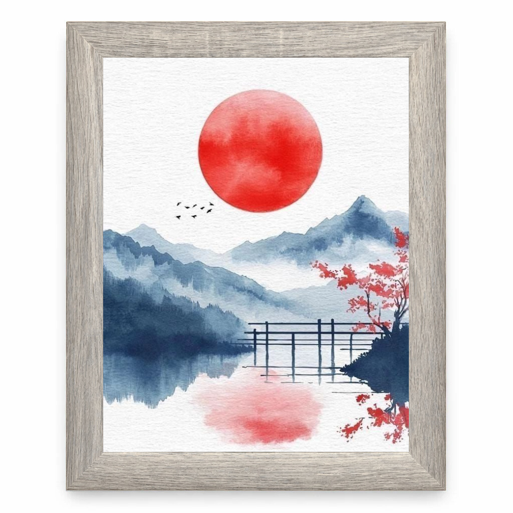 This poster captures peaceful mountains, calm water, and the quiet power of the rising sun.